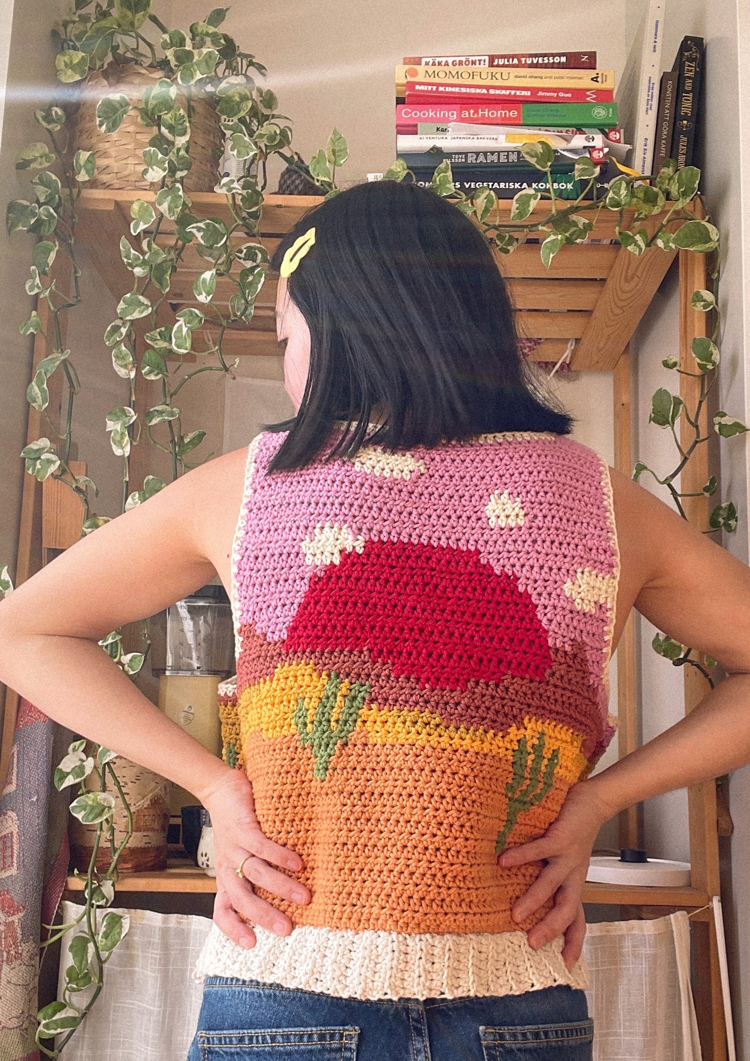 The vest landscape motif stretches across the two panels into a continuous landscape.