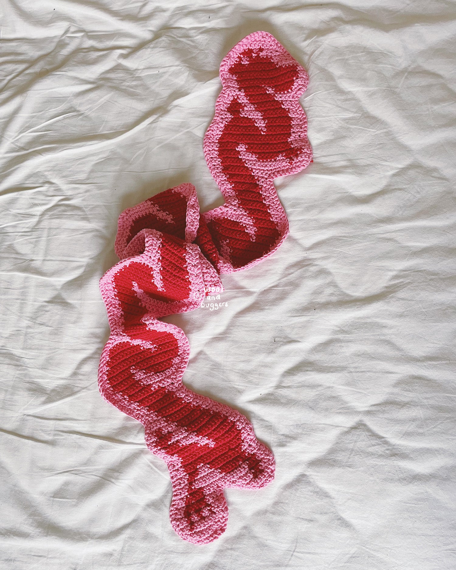 The pattern is inspired by @devout_hand’s animal scarves and @destiny.makes’ cut-out crochet colorwork pieces – check out their work on Instagram!