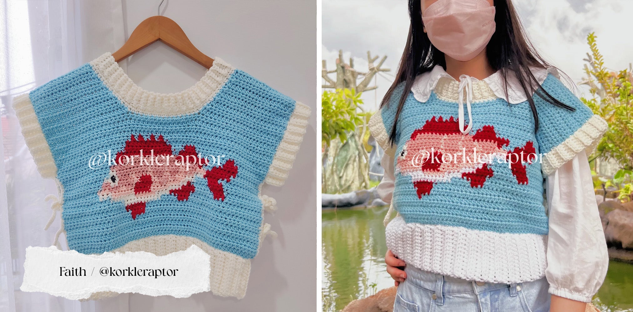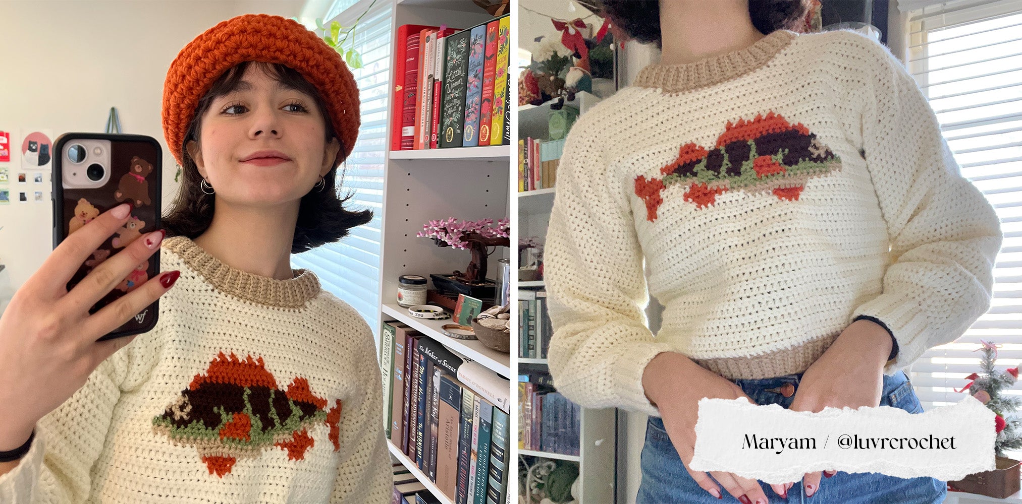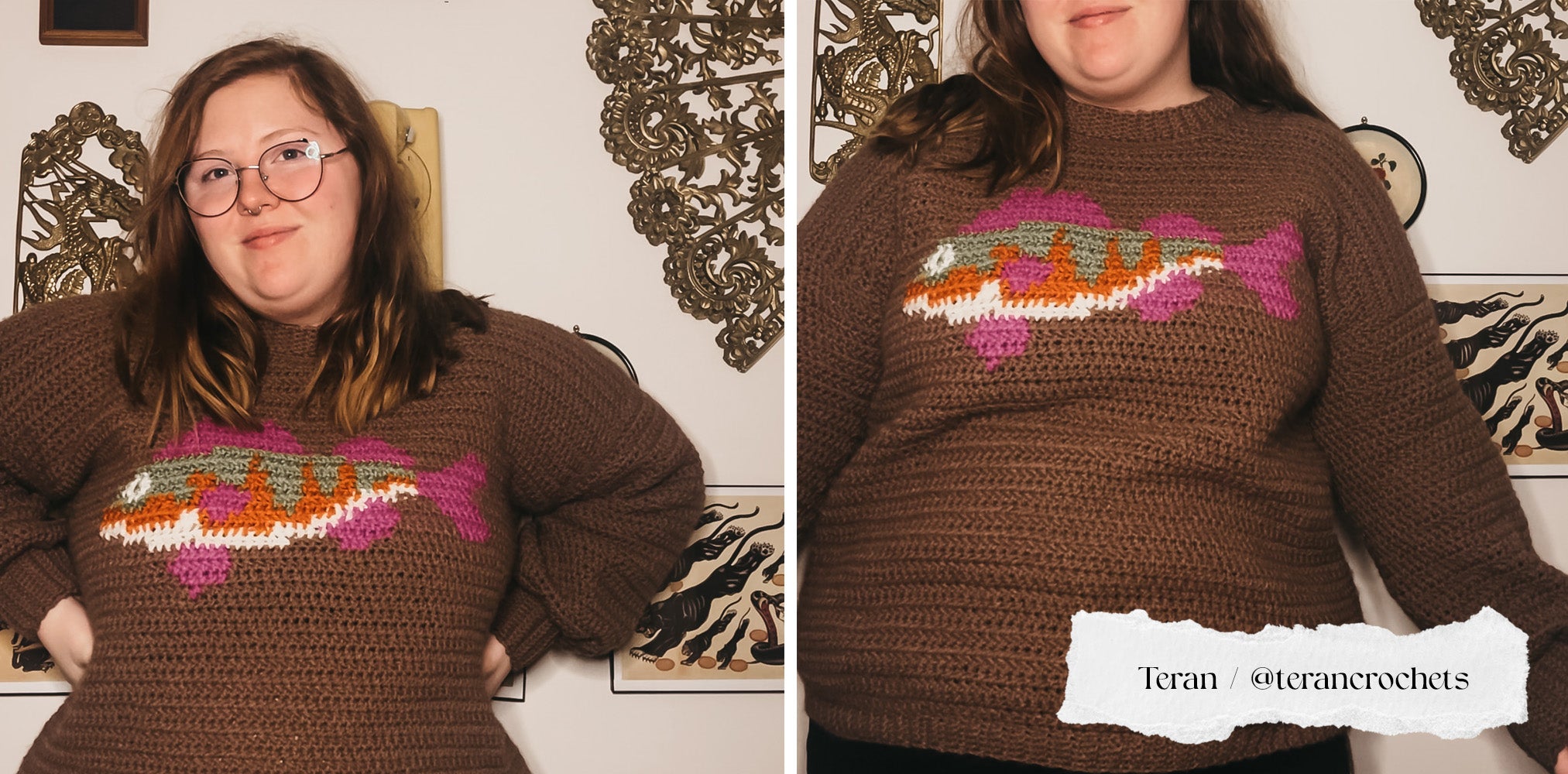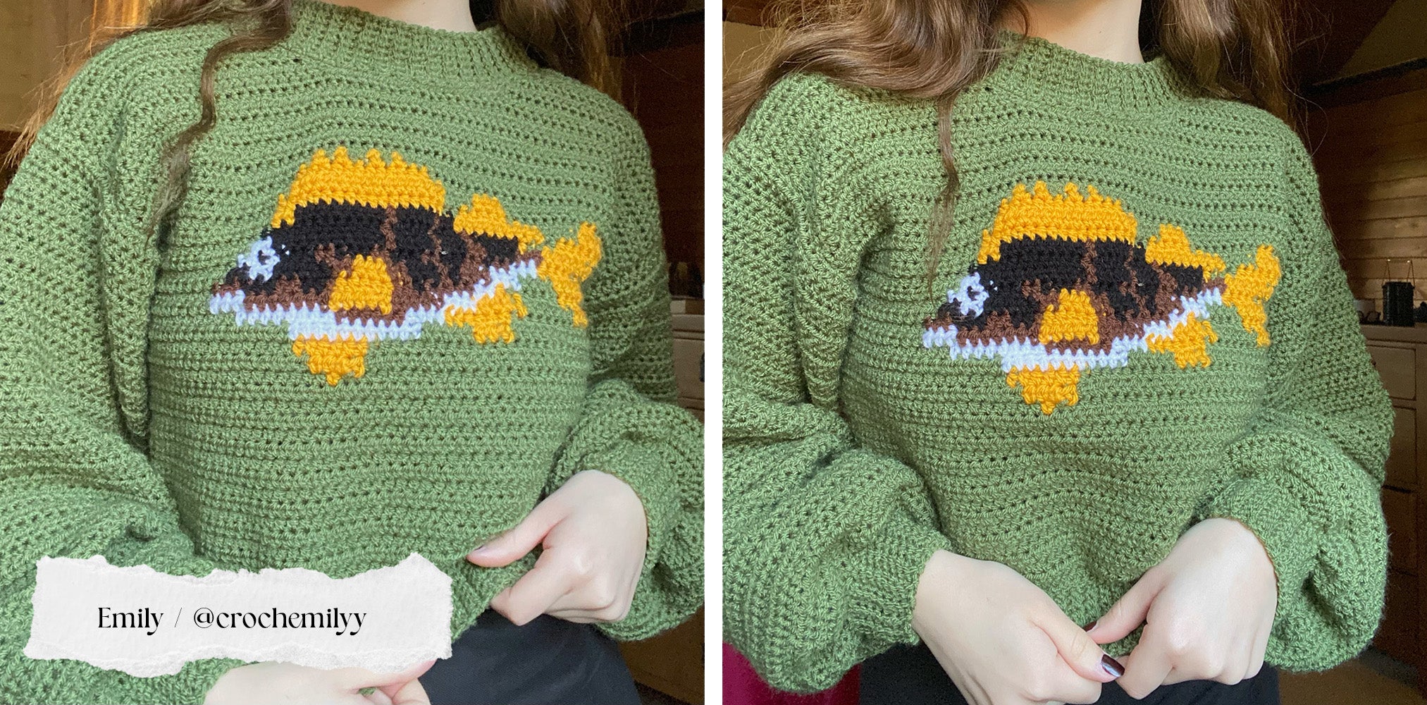 The Fishy Aleks Sweater is by far our most popular crochet pattern. With a timeless crewneck sweater base graded in sizes XS – 5XL, along with a fun colorwork design, the pattern is suitable for advanced beginners or beginners looking for a challenge.