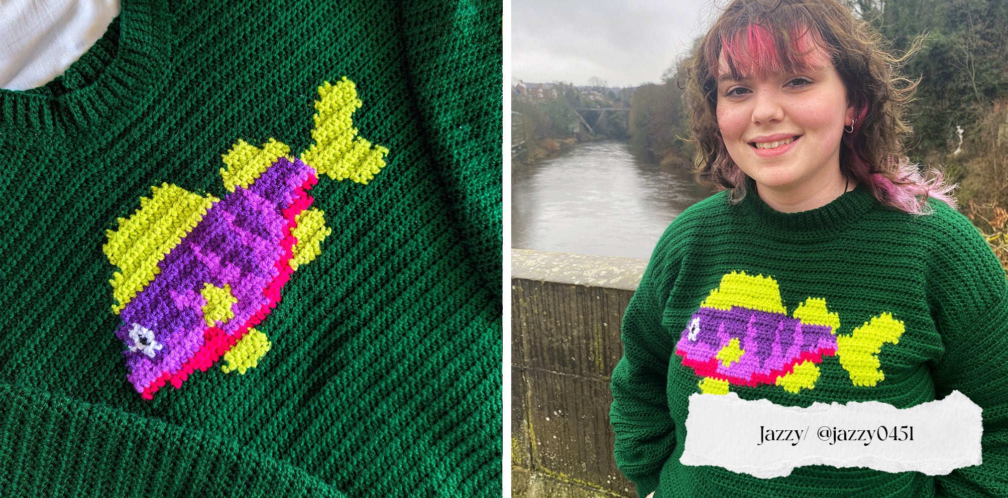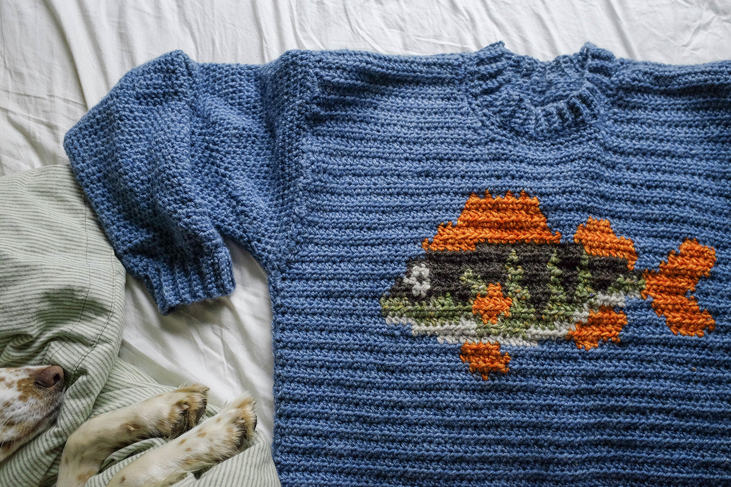 The sweater features a perch – which is Aleks preferred fish to fish for – but can easily be changed into any other fish, by modifying the colors. 🐡🐠🐬