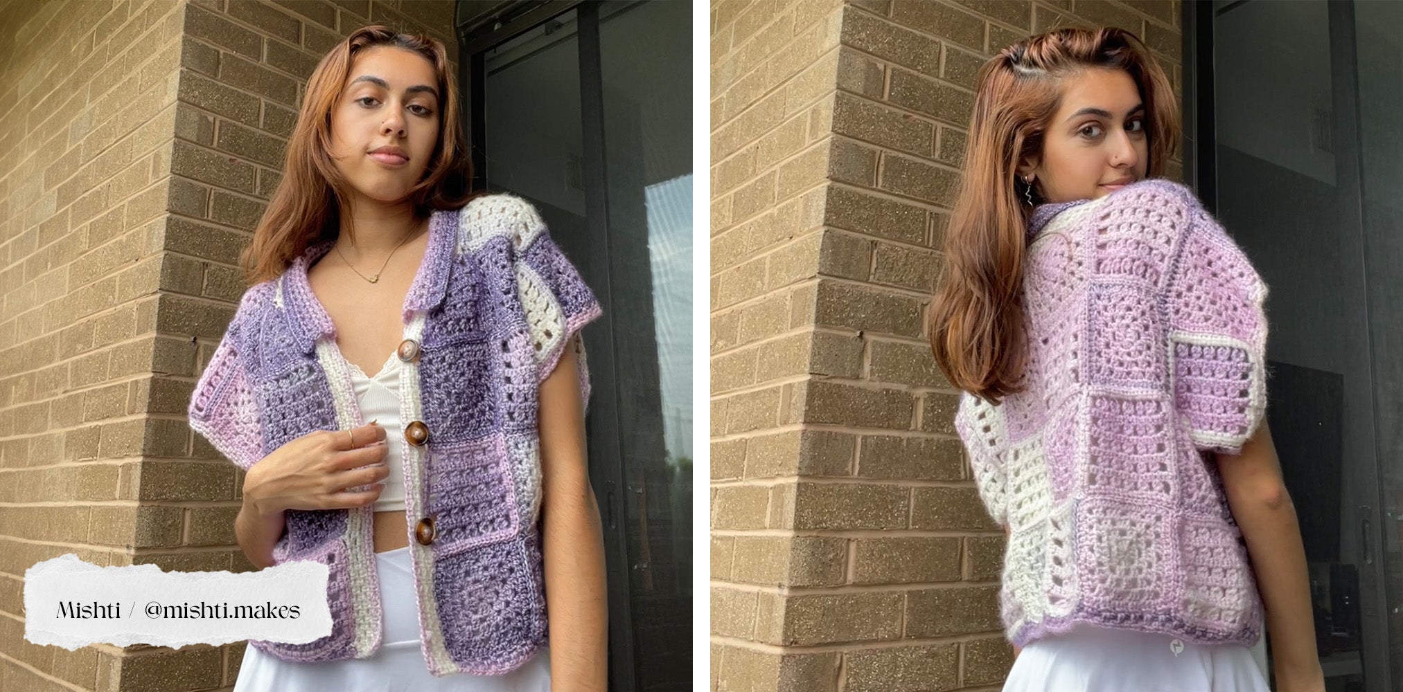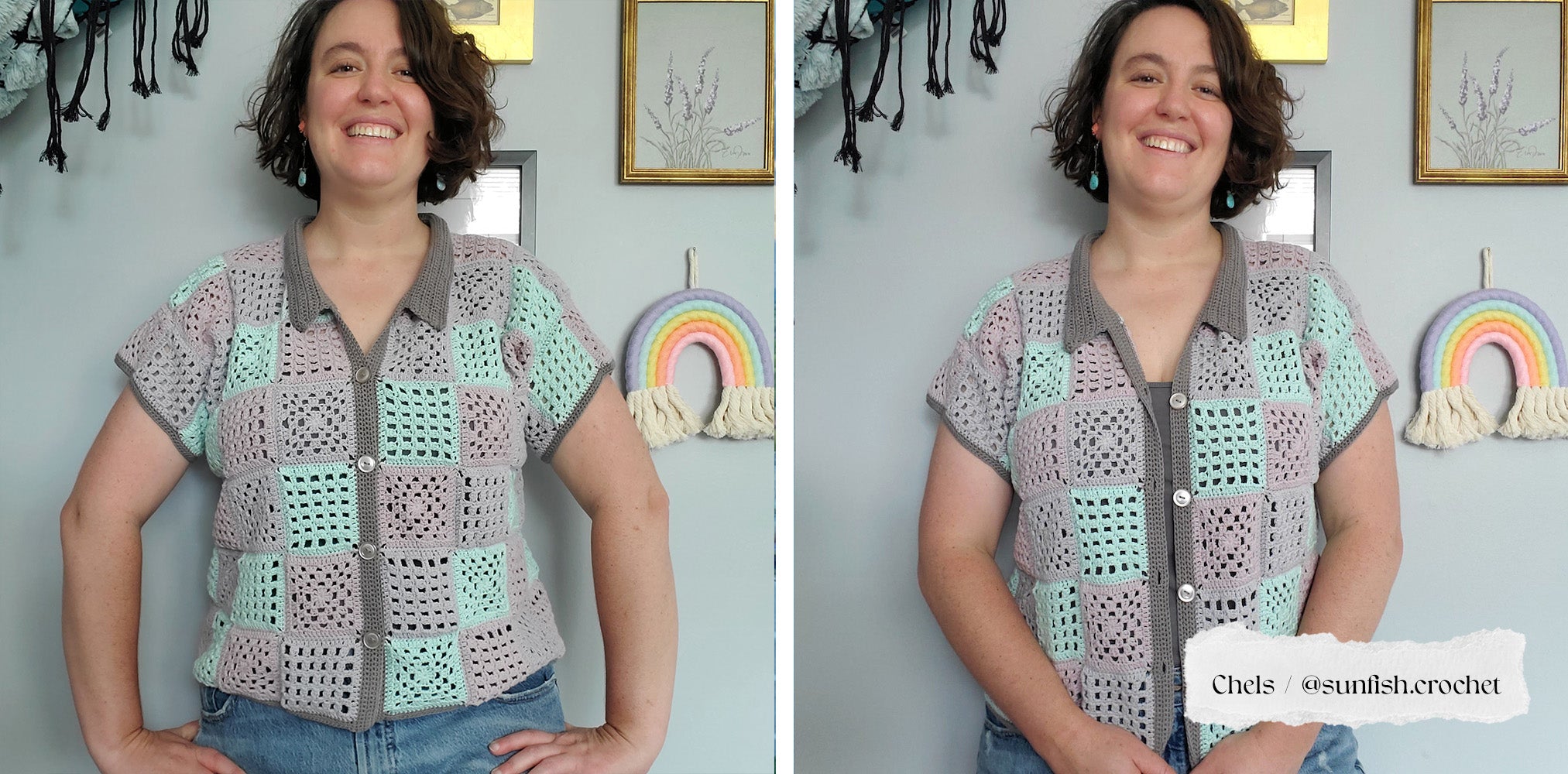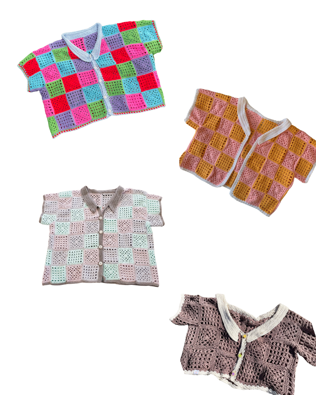 A summer staple, the Milk Tea button-up is a versatile blouse made out of mesh granny squares.