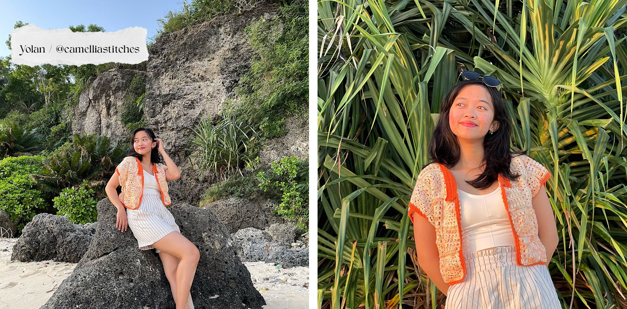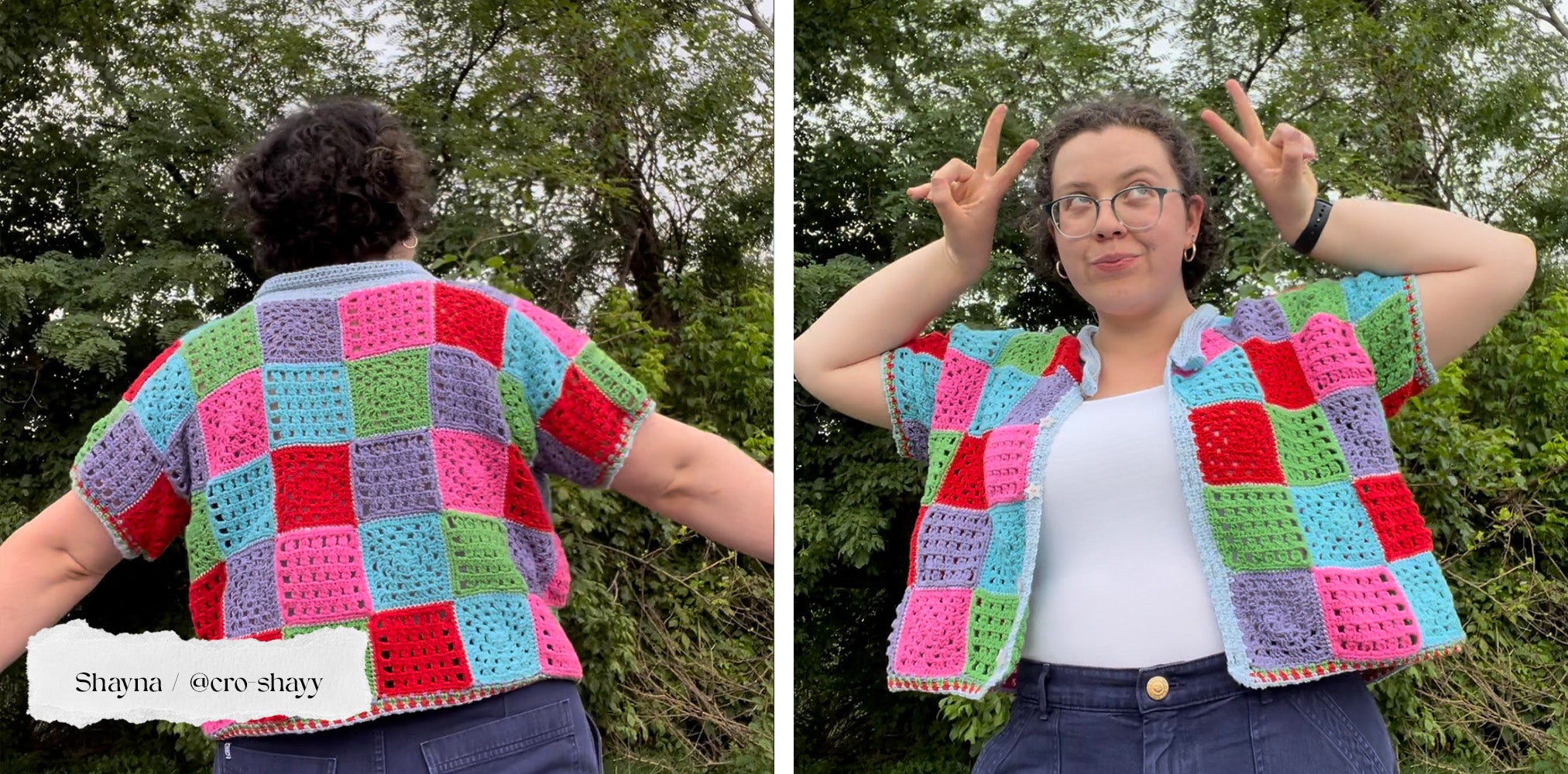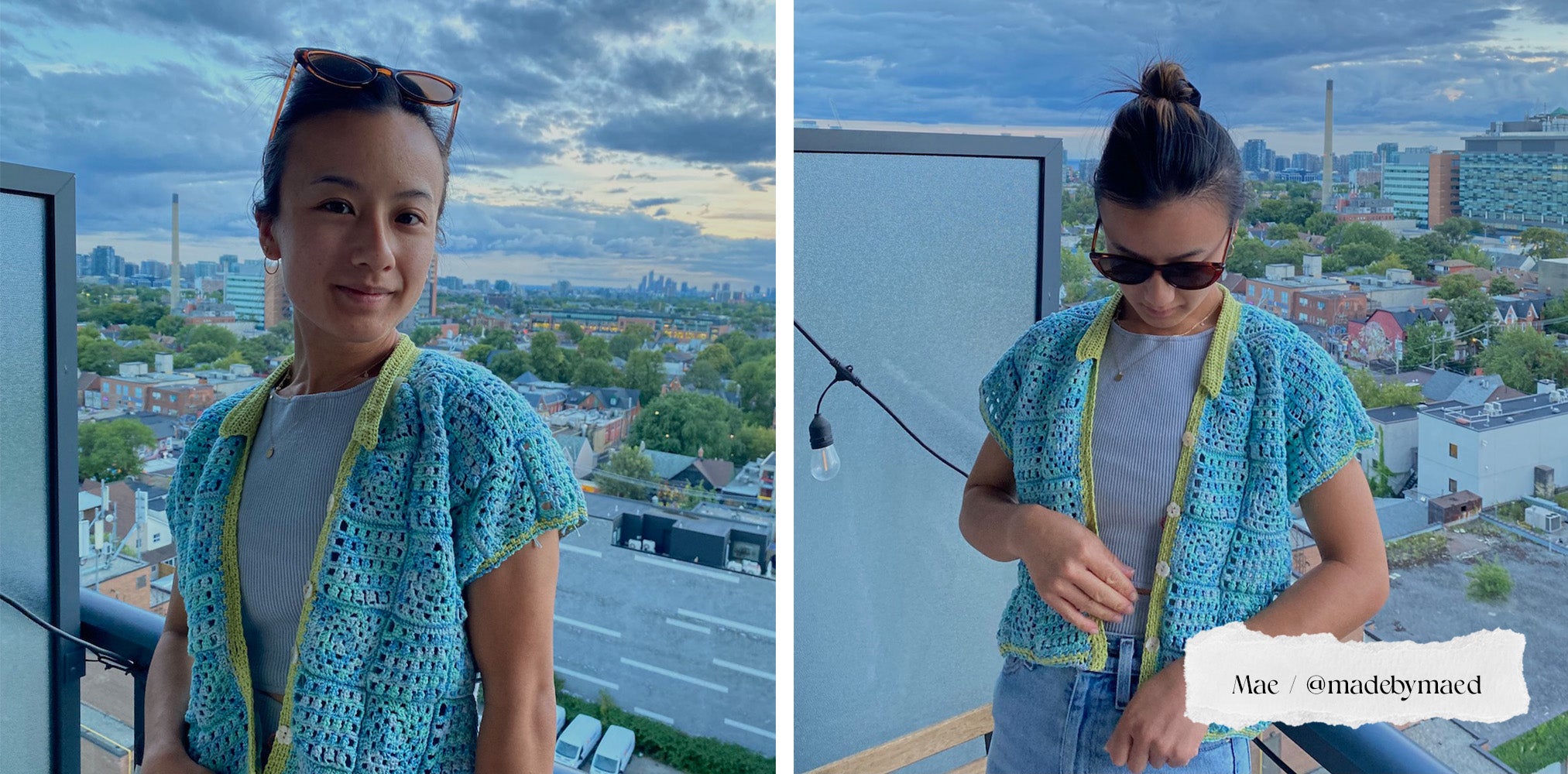 A summer staple, the Milk Tea button-up is a versatile blouse made out of mesh granny squares.
