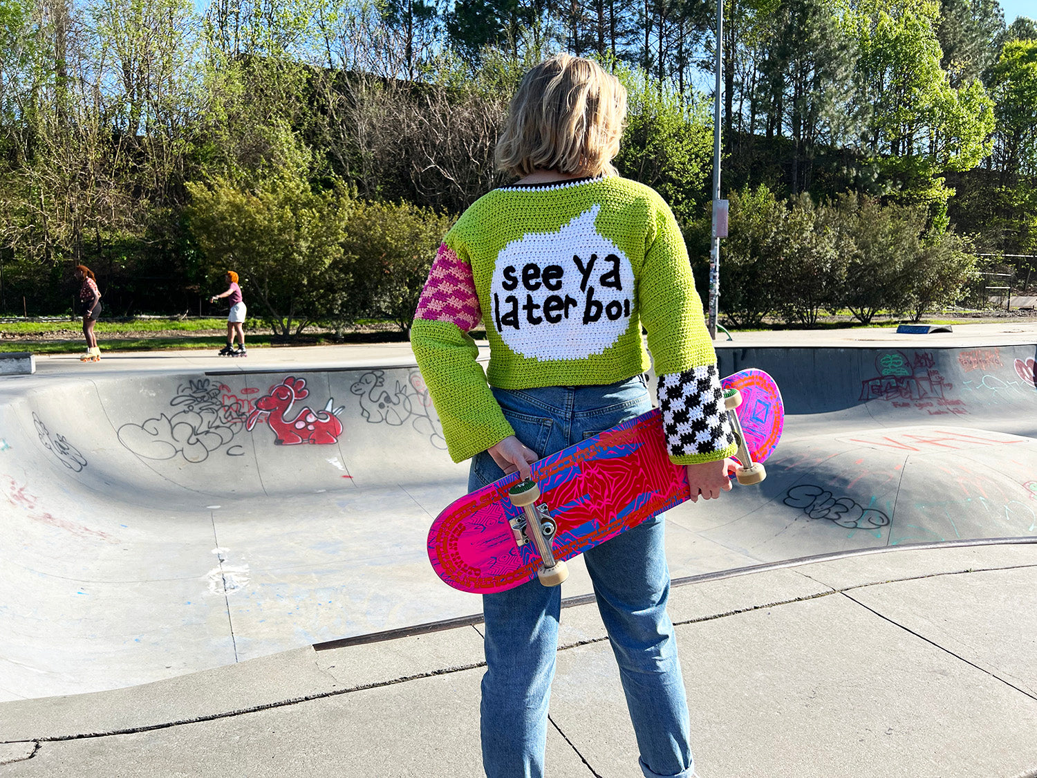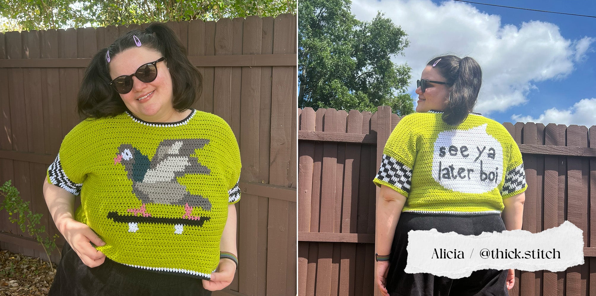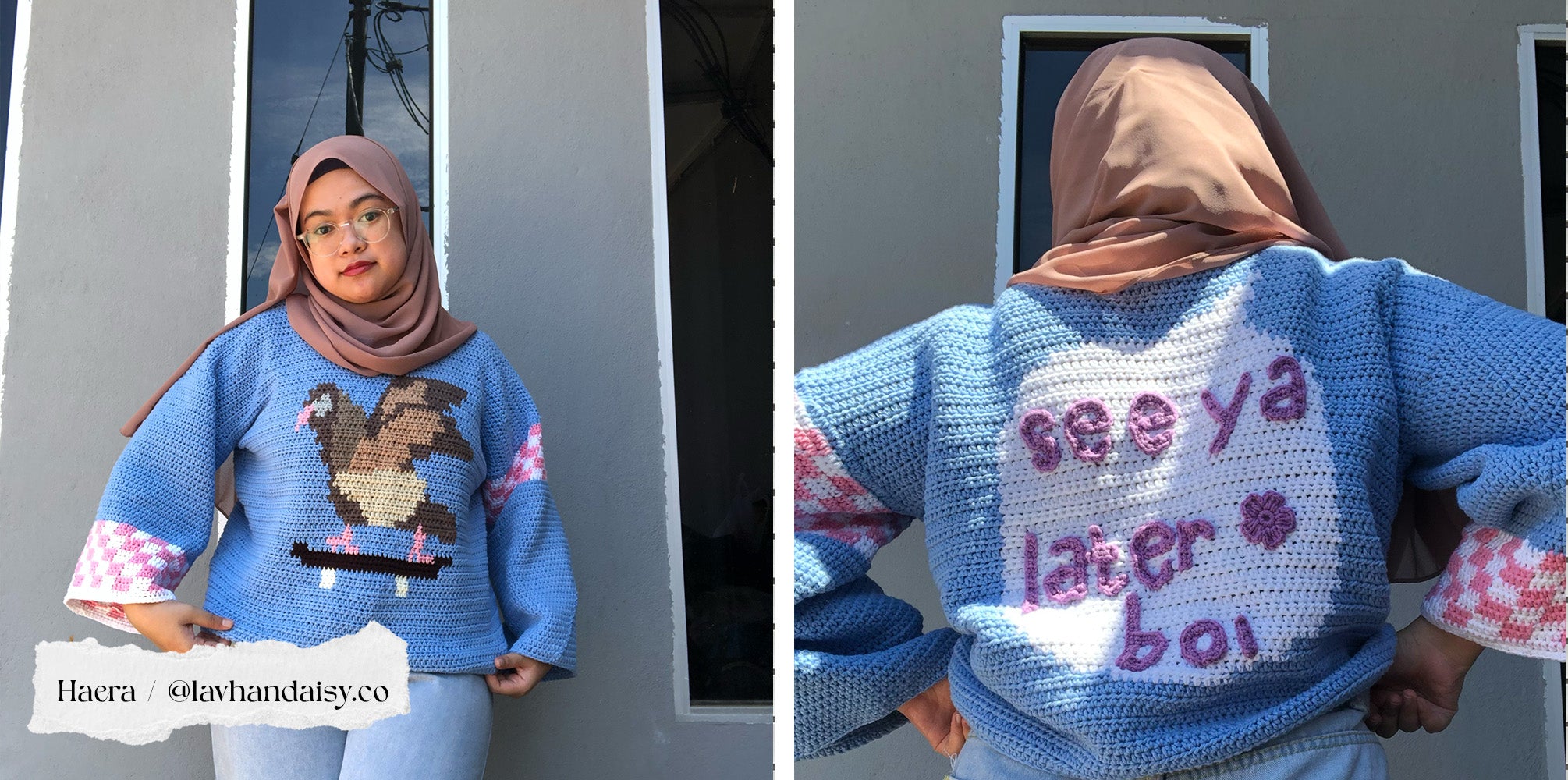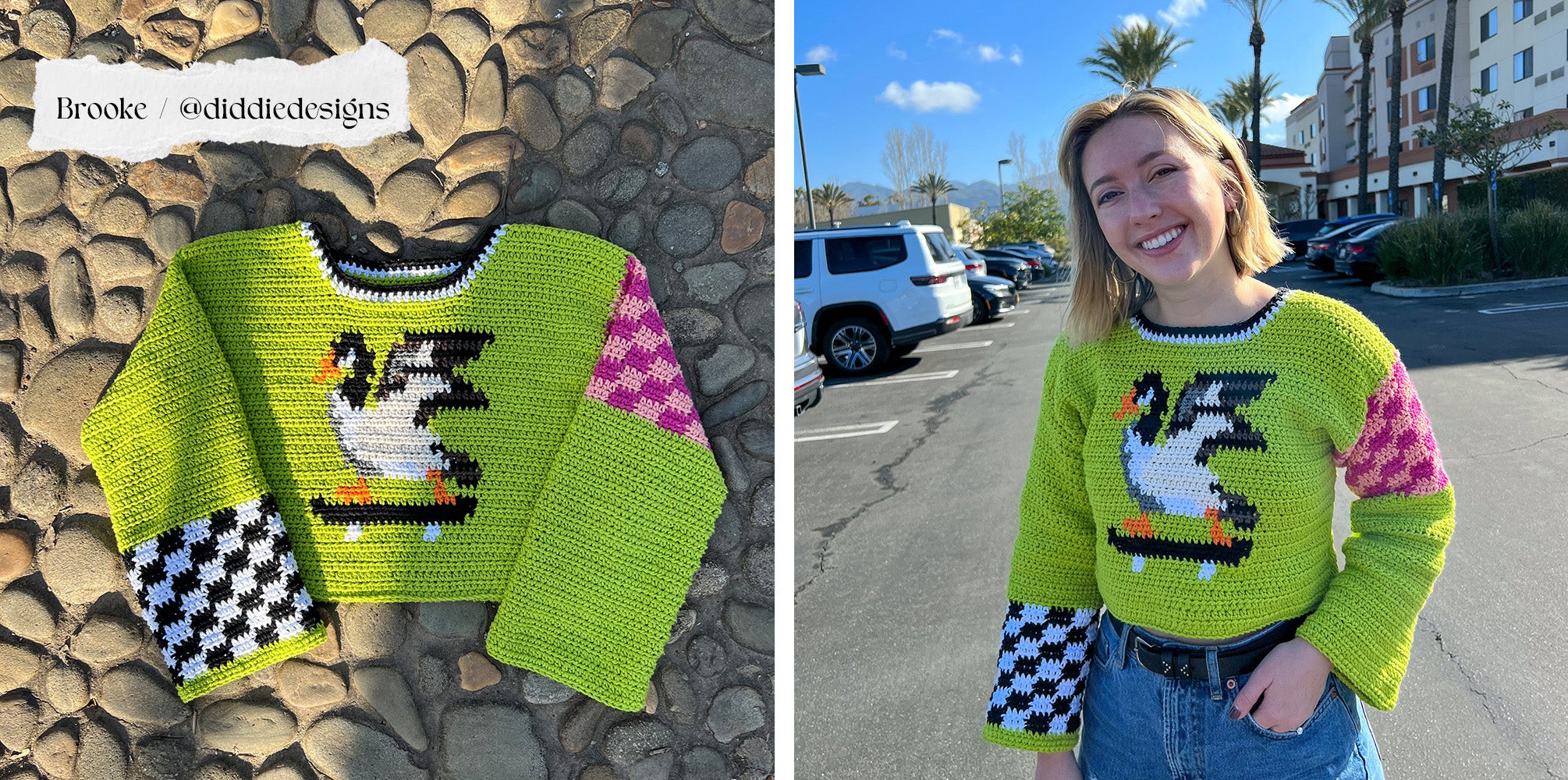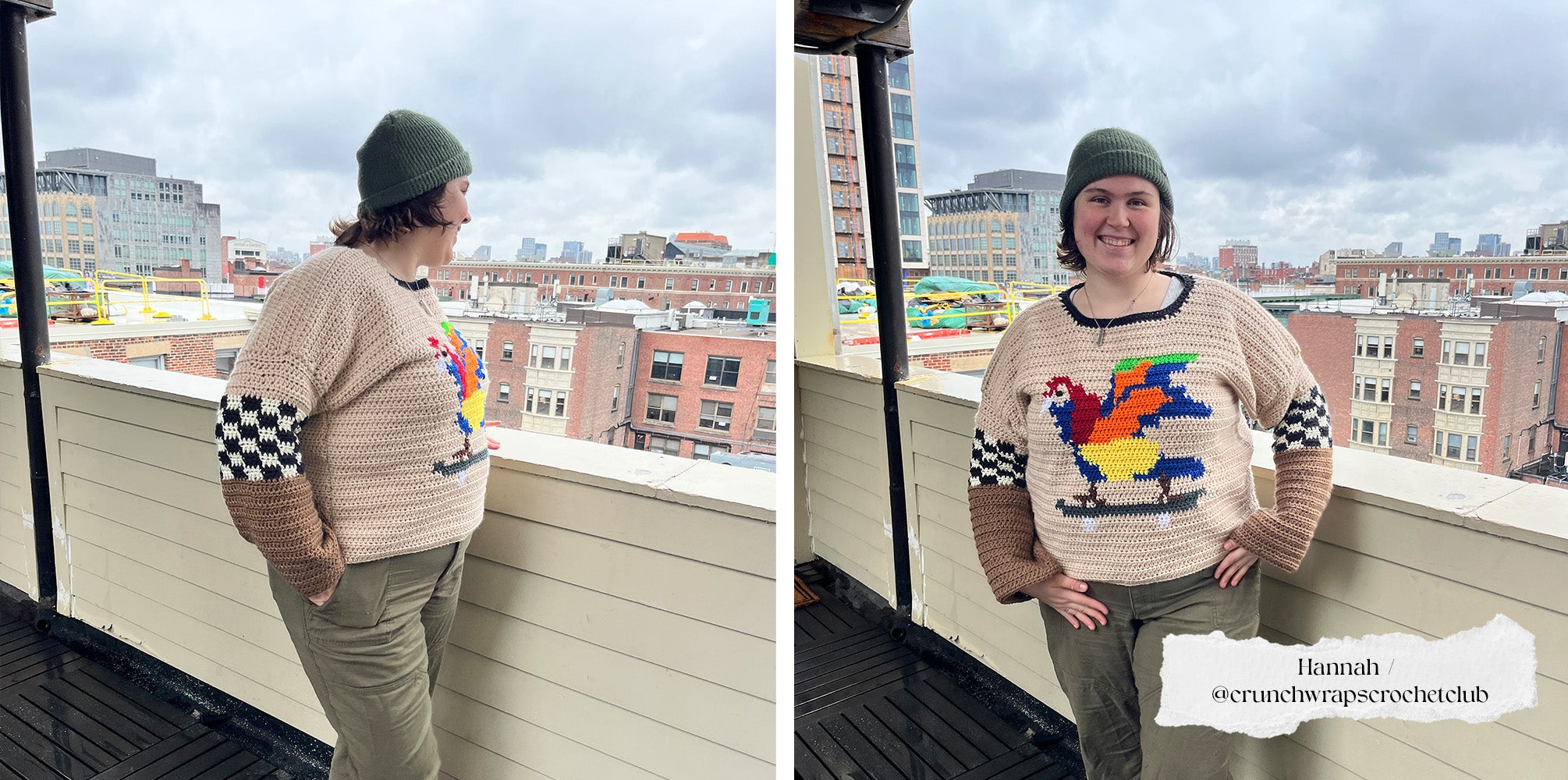The most comfortable crochet sweater with big sleeves and a wide neckline. Coupled with crochet colorwork and letter appliques, this is one of my favorite makes – the crocheting is just VERY FUN ok, trust us! This pattern is suitable for advanced beginners and up.
